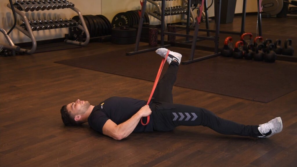 Rozciąganie przywodzicieli uda leżąc z gumą power band 0 (0)