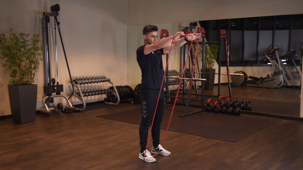 Unoszenie ramion do przodu stojąc z gumą power band 0 (0)